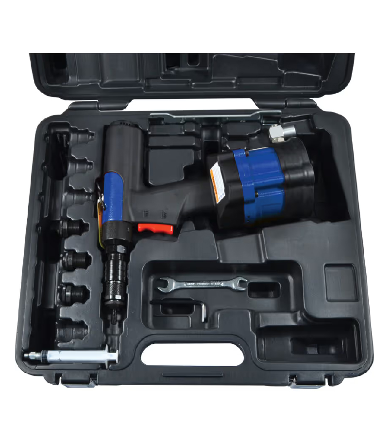 The KHRN01 Air Rivet Nut Tool is ideal for efficient rivet nut installation in various assembly applications. Its ergonomic pistol grip ensures comfortable handling and reduced fatigue, while the lightweight design allows for easy use in tight spaces. The air-powered mechanism provides consistent power for fast, precise results, supporting rivet nut sizes M4 to M12. It boats a one-step rocker trigger, adjustable stroke, and dual-sided air inlet for versatile control. Durable and reliable, it’s perfect for garages, workshops, and industrial use, and comes with a storage case, oiler, hex wrenches, and multiple rivet nut heads.